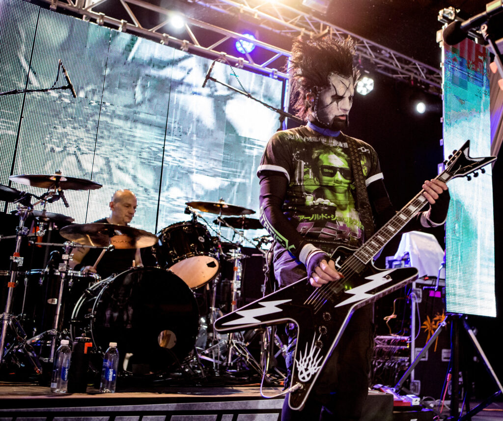 While the super early start meant that many missed most of Dope’s set the slight delay in Wednesday 13 hitting the stage meant that most late arrivals caught the majority of their startling Gothic Punk set that featured Astro Psycho and Get Your Grave On. The atmospheric lighting and luminous paint, making for one visual feast.